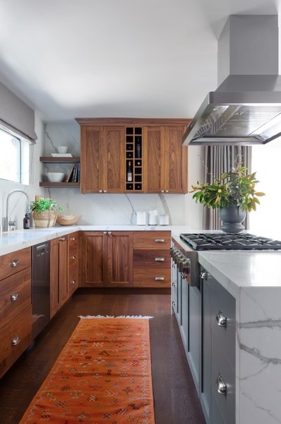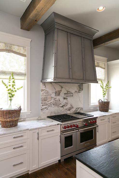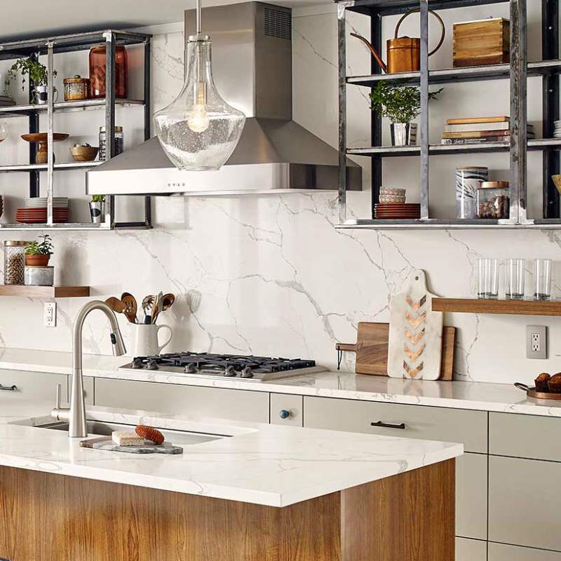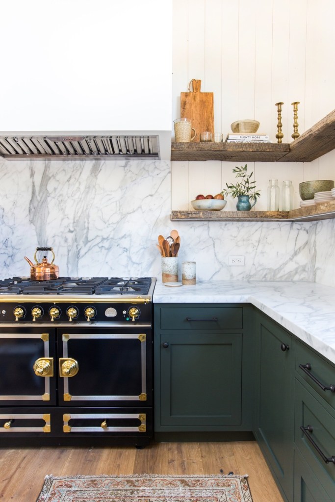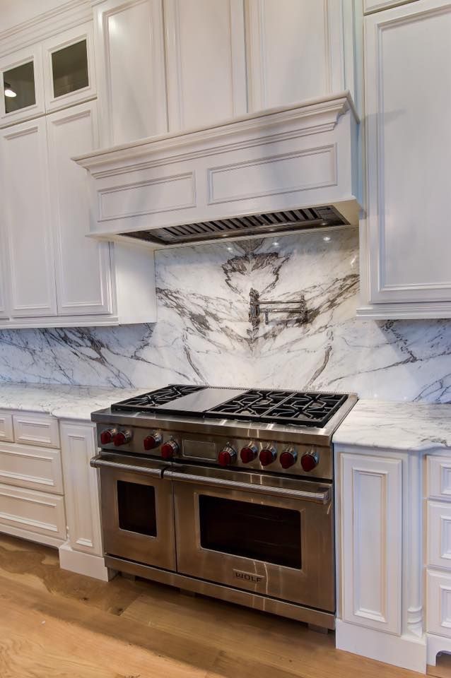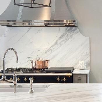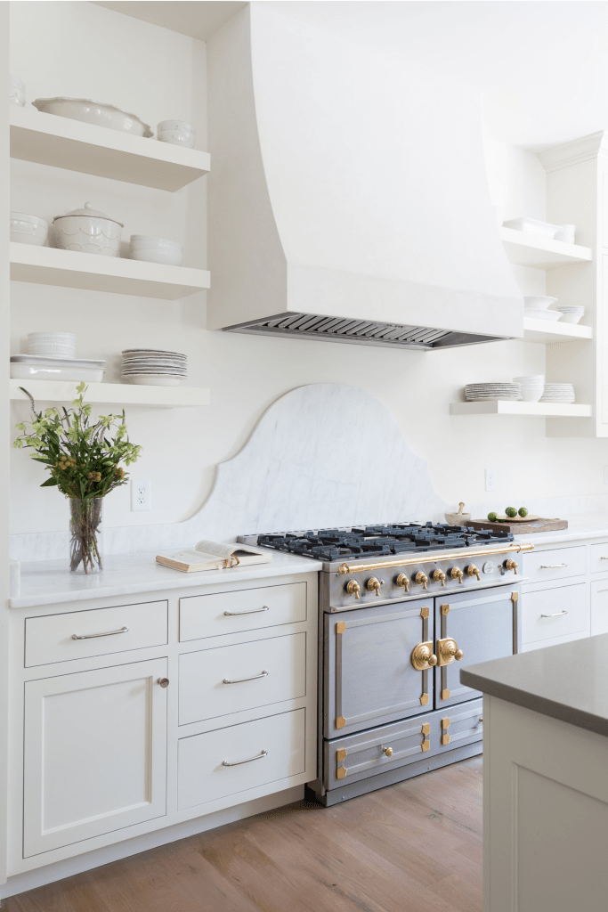 If you are going with a classic design, maybe full slab backsplash is not for you. A stone plate behind the range might be more fitting. Adding some curves allows for a smoother transition, adding charm and elegance.